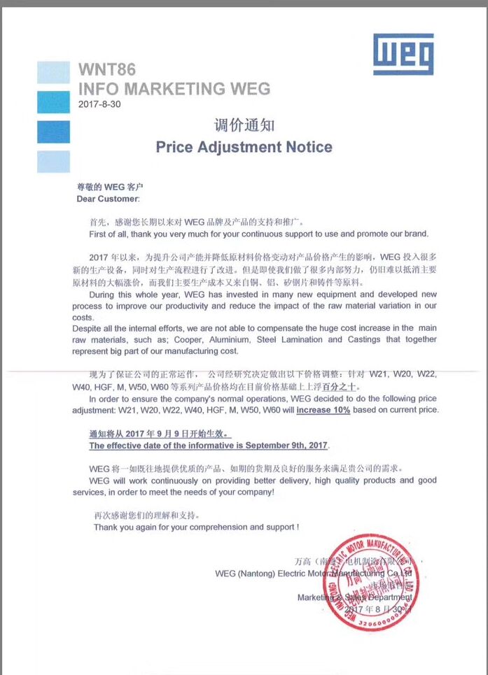 感謝貴公司長期以來選用WEG電機產品,因電機制造相關原材料上漲,現(xiàn)在為了保證公司的正常運作,公司研究決定作出以下價格調整,針對W21,W20,W22,W40,HGF,M,W50,W60系列上浮10%。