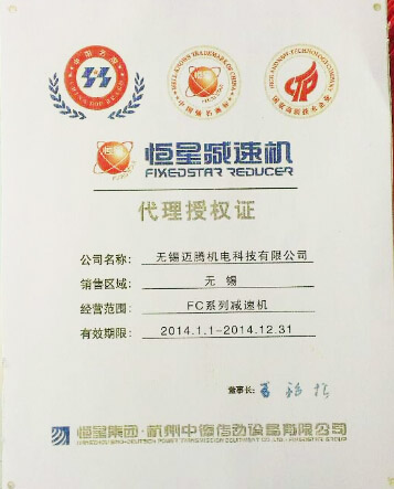 邁騰榮譽(yù)資質(zhì)---2014恒星減速機(jī)授權(quán)代理證書