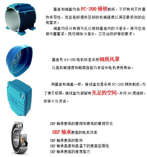 三相異步電機(jī)的機(jī)座由F-200鑄鐵制成,不僅有利于改善熱傳導(dǎo)性,而且能夠提供足夠的機(jī)械強(qiáng)度以滿足苛刻的應(yīng)用需求。為了方便安裝,機(jī)座號(hào)112M以上的型號(hào)均配有吊環(huán)。