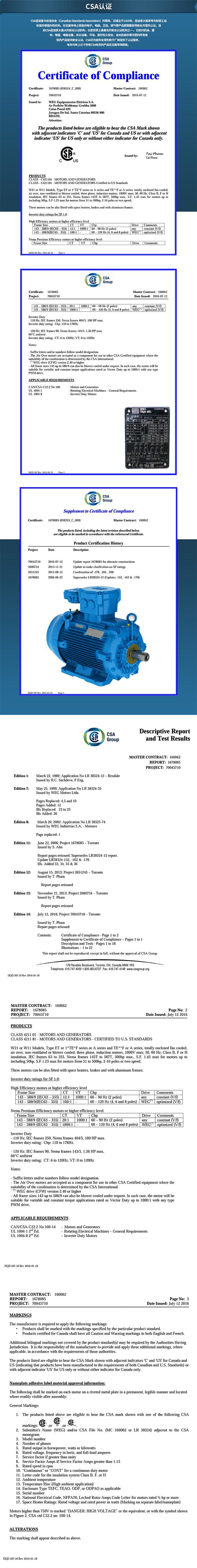WEG電機生產(chǎn)的節(jié)能電機符合加拿大CSA認證標準,WEG生產(chǎn)的電機具有著低噪音、低震動、效率高、兼容WEG變頻器等特點,我們銷售的電機在加拿大也享受WEG質(zhì)保18月的服務(wù)。